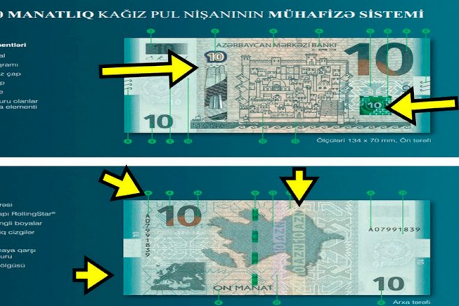 Qeyd edək ki, yenilənmiş 10 manatlıq pul nişanında əsas dizayn elementləri (İçəri şəhərin və Qız qalasının sxematik təsviri, Azərbaycanın xəritəsi və Avropaya inteqrasiya, bir sıra milli xalça naxışları) saxlanılıb.