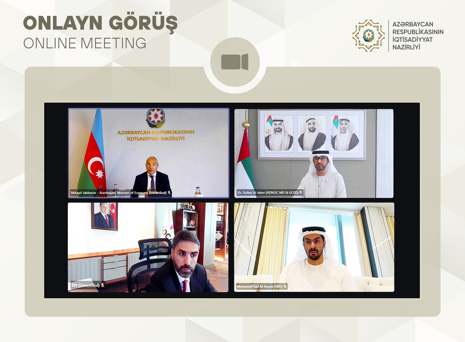 Yenisabah.az xəbər verir ki, İqtisadiyyat naziri Mikayıl Cabbarov SOCAR-ın prezidenti Rövşən Nəcəflə birlikdə Birləşmiş Ərəb Əmirliklərinin (BƏƏ) sənaye və qabaqcıl texnologiyalar naziri Sultan Əhməd Əl-Cabirlə videokonfrans formatında görüş keçirib.