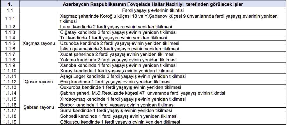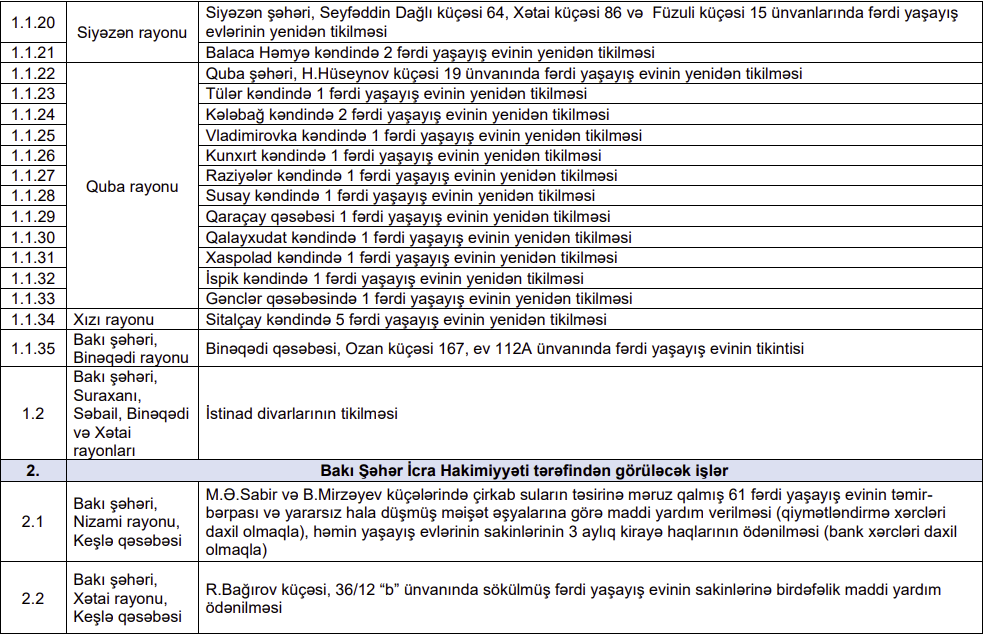 "Yeni Sabah" xəbər verir ki, bu Prezident İlham Əliyevin Sərəncamında öz əksini tapıb. Görüləcək işlərin siyahısında fəlakət nəticəsində zərər dəymiş evlərin yenidən tikintisi nəzərdə tutulur. Həmin evlərin siyahısını təqdim edirik: