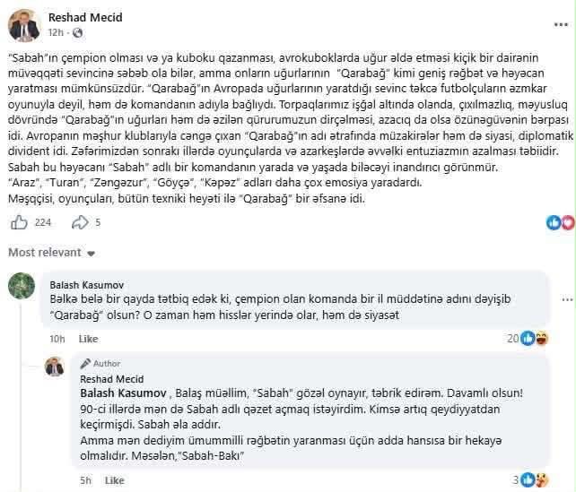 R.Məcid paylaşımında “Sabah” adının uğurlu seçim olduğunu vurğulasa da, milli rəğbət üçün klub adında daha dərin hekayənin olmasının vacibliyini qeyd edib. O, nümunə kimi “Araz”, “Turan”, “Zəngəzur”, “Göyçə”, “Kəpəz” kimi adların daha çox duyğu oyada biləcəyini yazıb.